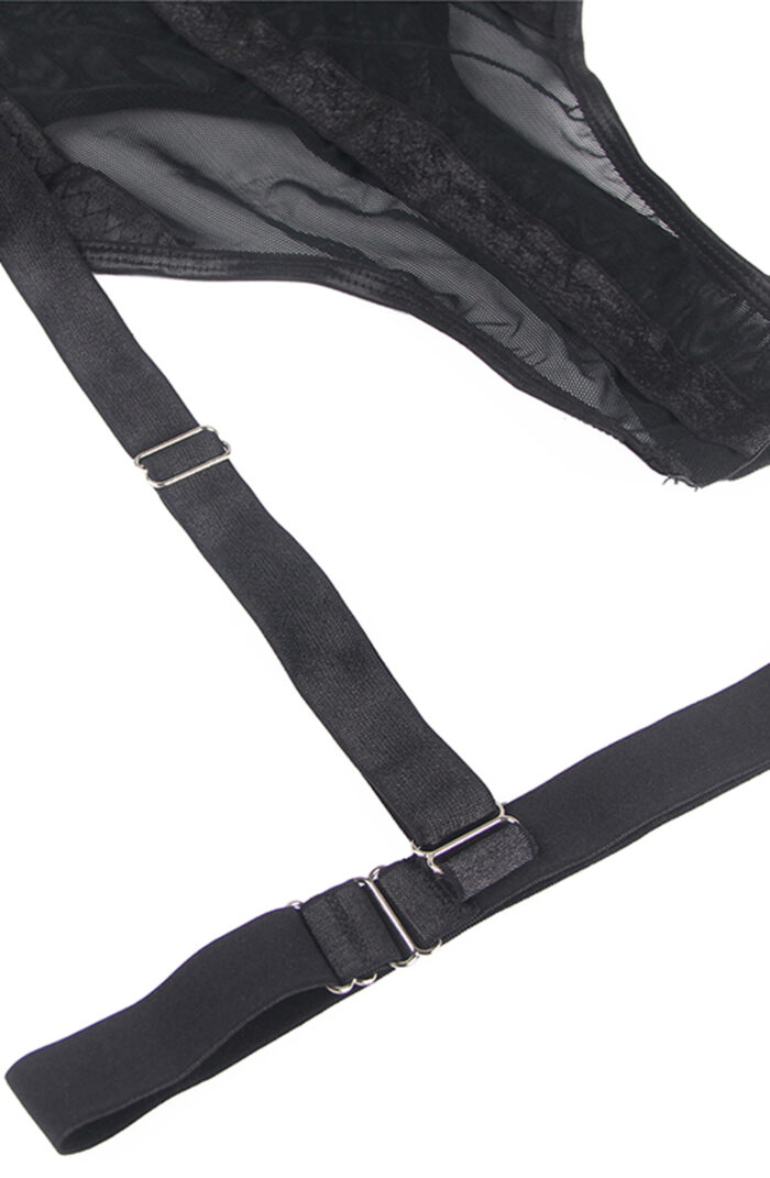 Stunning  body suit with elegant lace detailing and adjustable suspender and leg straps.   Adjustable popper fastening.    Make this gorgeous bodysuit your perfect evening look by pairing it with either your favourite jeans or hold ups.